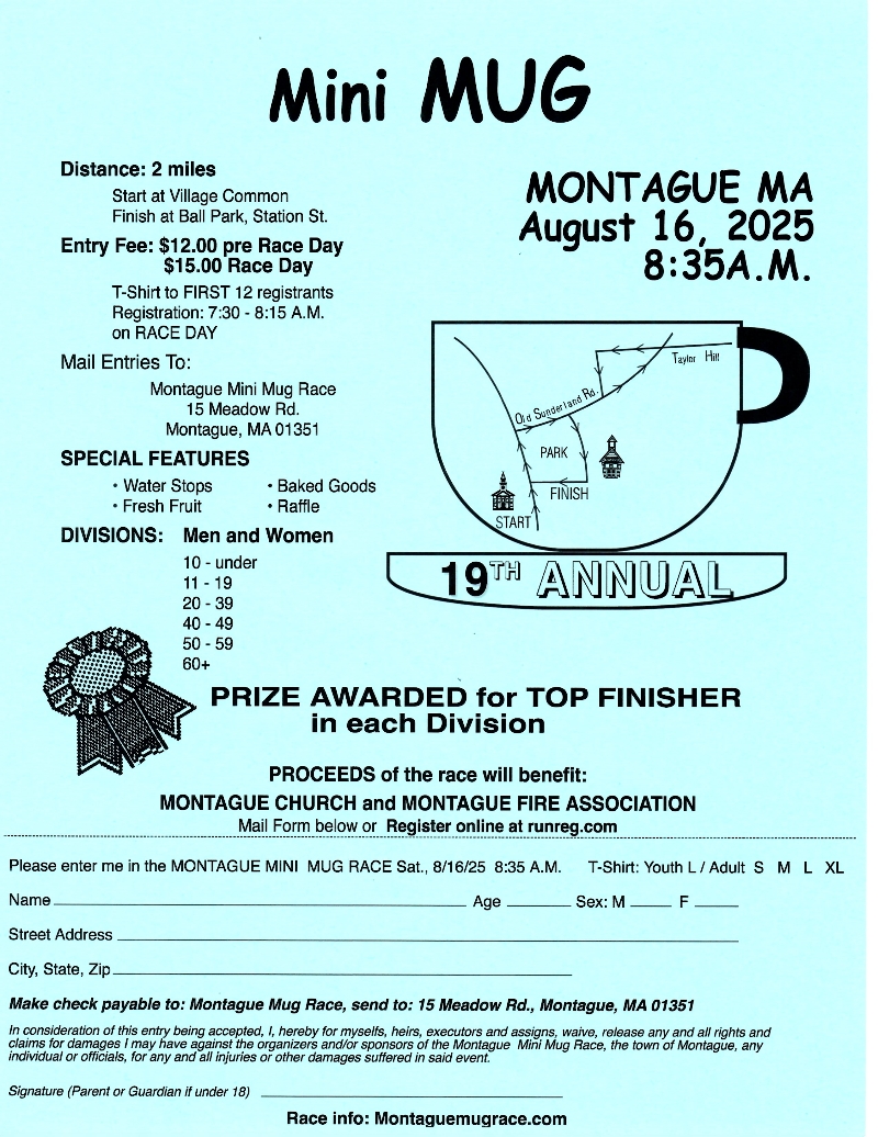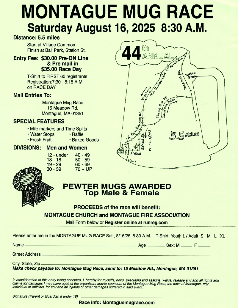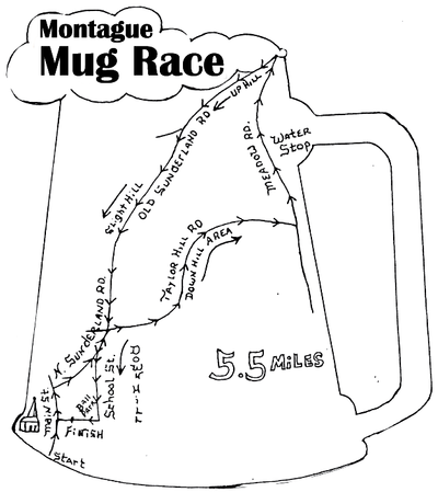 The 43rd Montague Mug Race is 5.5 miles in length. Starting line is north east corner of Village Green, heads south down Main to Old Sunderland Road. At the first mile the course runs up a challenging hill to the top of Taylor Hill. It continues running down to the flat part of the course (partial dirt road) along the Connecticut River. Shortly after mile 3 it makes a hair pin turn up onto Old Sunderland Road. Continues past the fire station and then makes a left hand turn onto School Street, downhill to a flat shady wooded finish line on Station Street.